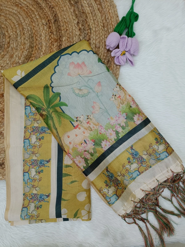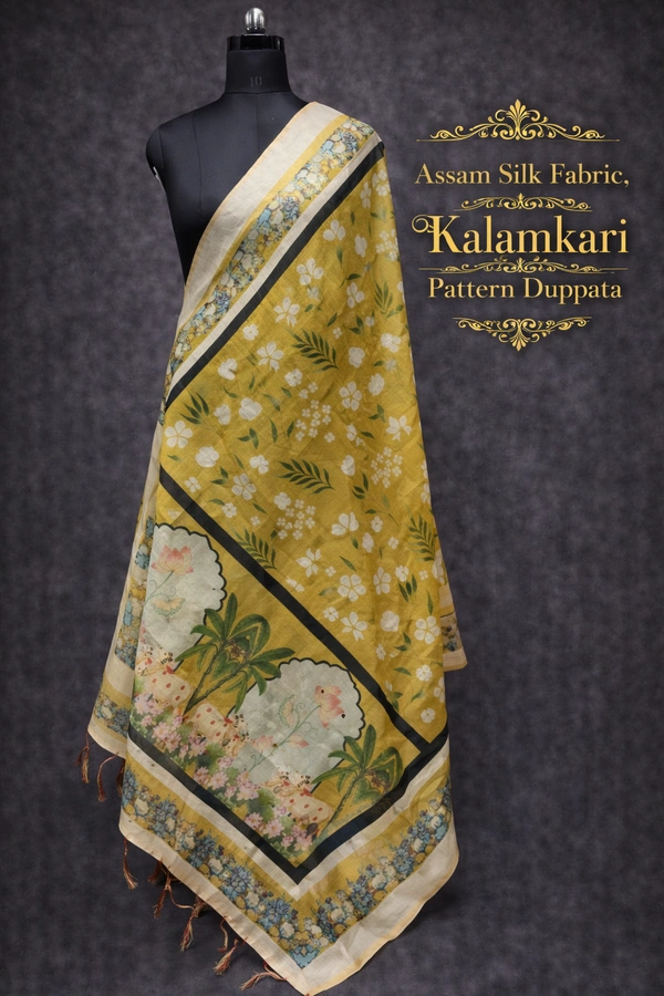 Assam Silk Duppata|Kalamkari Pattern Prints| 2.25 mts Length| Mustered Yellow | AS195004