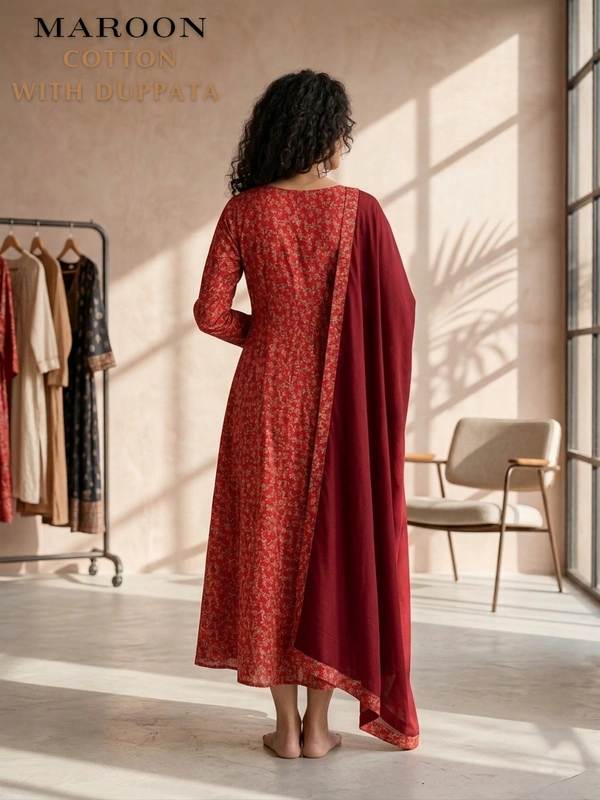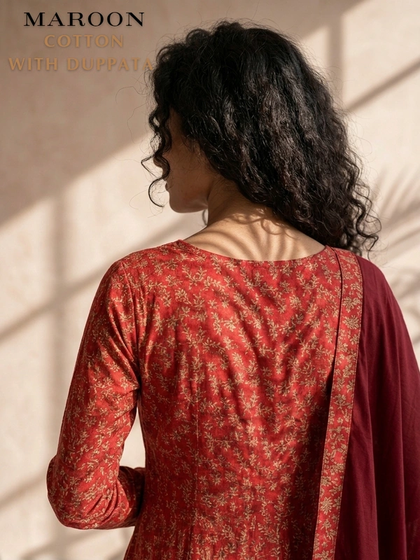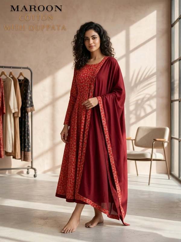 Maroon Cotton A-Line Kurti Dress with Dupatta