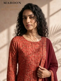 The A-line silhouette gives a flattering fit for all body types, while the rich maroon shade adds a classy and festive vibe. Paired with a matching dupatta, this set is perfect for daily wear, office looks, and special occasions.