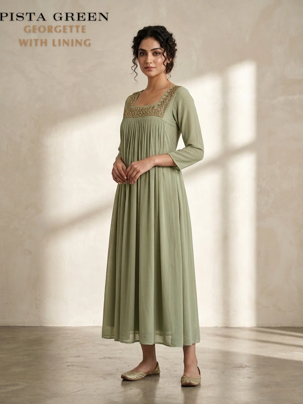 Designer Frock | 3/4th Sleeve| Georgette Yoke Work|with Lining| Pista Green | FW45502