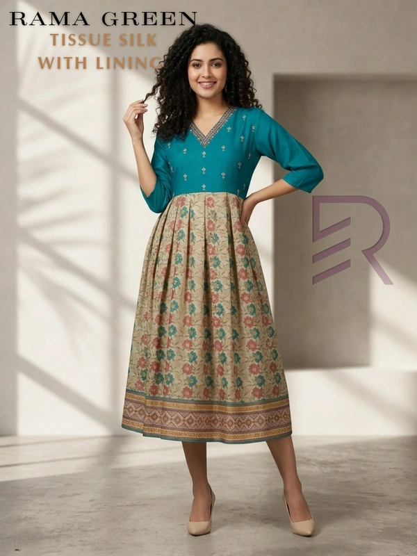Designer Frock | 3/4th Sleeve| Tissue Silk | Rama Green | FW46005