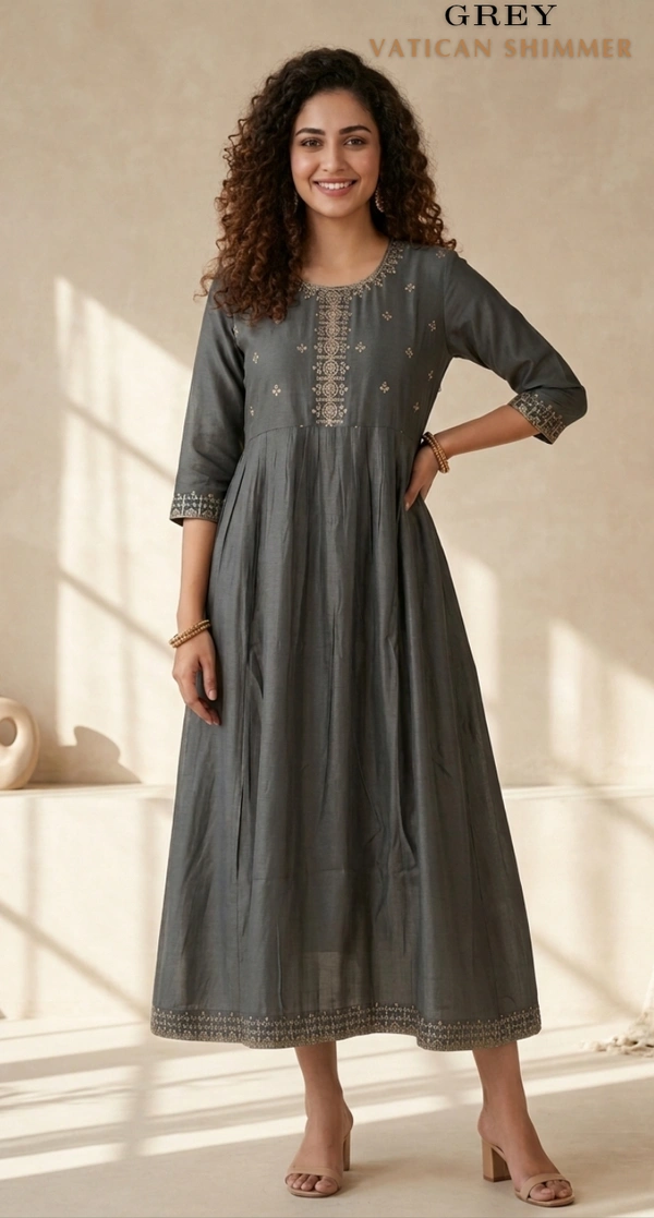 Elevate your ethnic wardrobe with our beautifully crafted flared dresses, designed to blend elegance with everyday comfort. Made from premium quality Chanderi Silk, Vichitra Silk, and Vatican Shimmer fabrics, these dresses feature a graceful silhouette with a finely detailed yoke and soft inner lining for all-day ease.