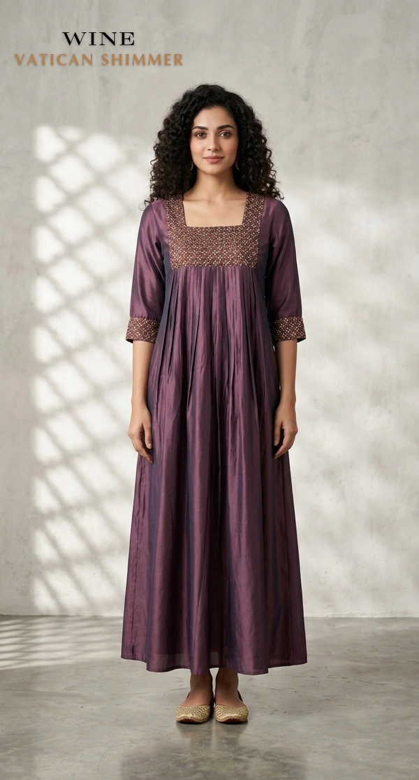 Elevate your ethnic wardrobe with our beautifully crafted flared dresses, designed to blend elegance with everyday comfort. Made from premium quality Chanderi Silk, Vichitra Silk, and Vatican Shimmer fabrics, these dresses feature a graceful silhouette with a finely detailed yoke and soft inner lining for all-day ease.