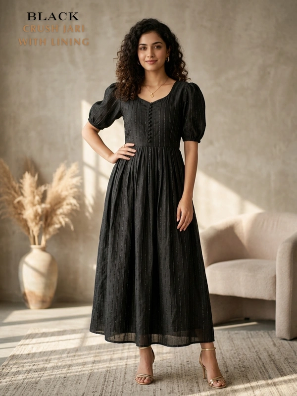 Designer Frock | Puff Sleeve| Crush Jari |with Lining| Black | FW415003