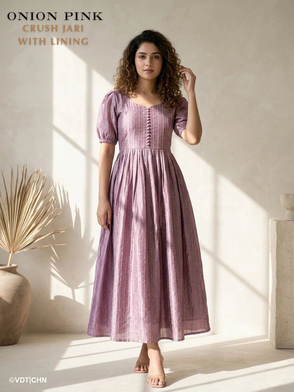 Designer Frock | Puff Sleeve| Crush Jari |with Lining| Onion Pink | FW415004