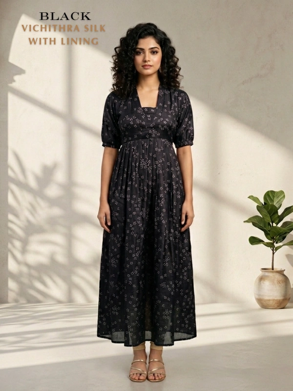 Designer Frock | Puff Sleeve| Vichithra Silk |with Lining| Black| FW55004