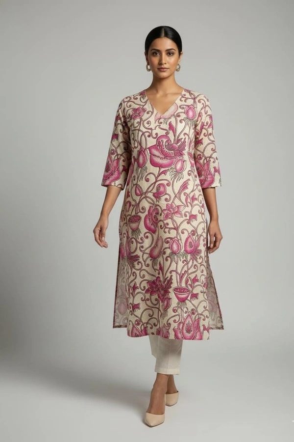 Kalamkari Side Cut Kurti � Product Description Add a touch of tradition with a modern twist to your wardrobe with this elegant Kalamkari Side Cut Kurti. Crafted from soft, breathable cotton fabric, this kurti features beautiful authentic Kalamkari prints that reflect timeless Indian artistry. The stylish side cut design adds a contemporary edge, allowing ease of movement and a flattering silhouette. Perfect for everyday wear, office use, or festive gatherings, this kurti pairs effortlessly with leggings, palazzos, or jeans. Designed for comfort and style, it keeps you relaxed all day while making a graceful fashion statement. ? Key Features: � Authentic Kalamkari print � Soft & breathable cotton fabric � Trendy side cut design � Comfortable regular fit � Suitable for daily, office & festive wear ?? Fabric: Cotton ?? Style: Side Cut Kurti ?? Print: Kalamkari ?? Length: Knee / Calf length (as per design)
