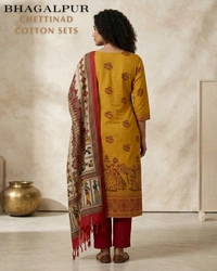 Mangalgiri Chettinad Kurti Set| With Lining| Combination of Khadi Silk Duppata | Mustard Yellow| KCS95005|