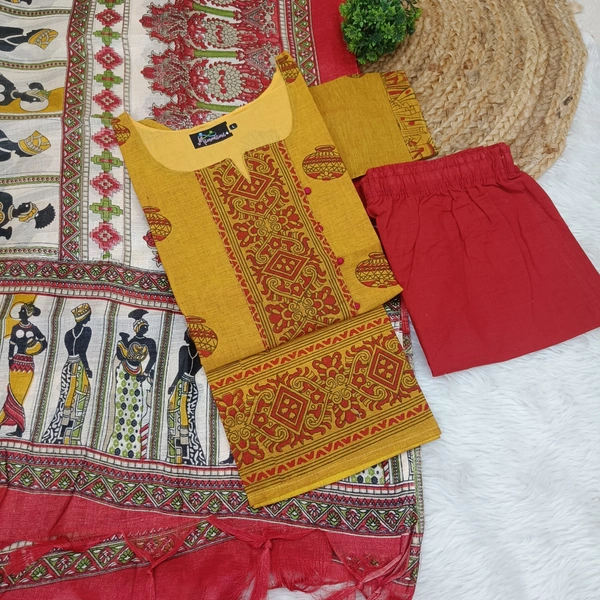 Known for its fine texture and durability, Mangalagiri fabric offers superior comfort, making it perfect for all-day wear. The kurti features subtle yet striking patterns, paired with a complementing bottom and dupatta that enhance its ethnic charm.