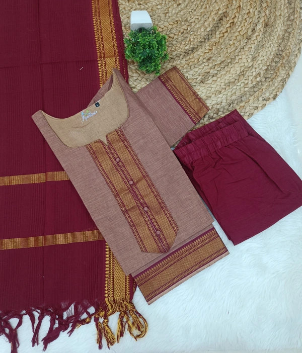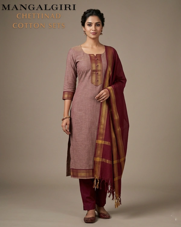 Mangalagiri Chettinad Kurti Set � A Blend of Heritage & Comfort Bring home the beauty of South Indian tradition with our elegant Mangalagiri Chettinad Kurti Set. Crafted from authentic Mangalagiri cotton and inspired by the rich Chettinad weaving style, this outfit reflects timeless craftsmanship with a modern touch. Known for its fine texture and durability, Mangalagiri fabric offers superior comfort, making it perfect for all-day wear. The kurti features subtle yet striking patterns, paired with a complementing bottom and dupatta that enhance its ethnic charm. Whether you're heading to work, a casual outing, or a festive gathering, this kurti set ensures effortless style and grace. Key Features: Premium Mangalagiri cotton fabric � breathable and skin-friendly Traditional Chettinad-inspired patterns and borders Comfortable fit for daily wear and long hours Colorfast and durable weave Suitable for office wear, casual outings, and small festive occasions Style Tip: Pair it with oxidized jewelry and juttis for a complete ethnic look.