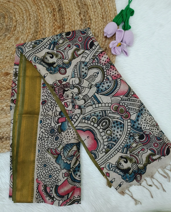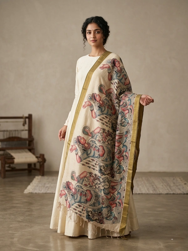 Pen Kalamkari Duppata|Kalamkari Pattern| 2.25 mts Length| Handcrafted| Cream | PKD5002