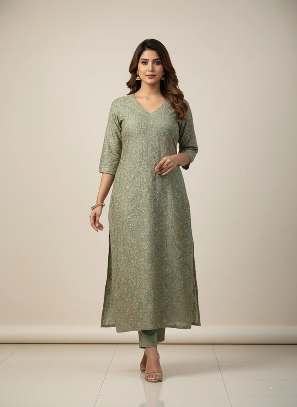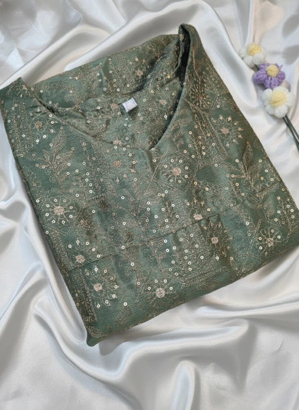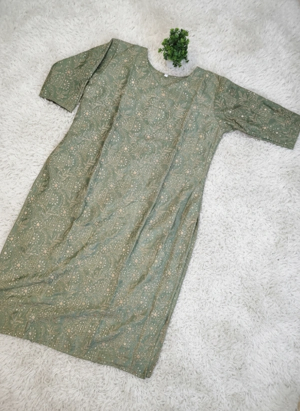 Designer Kurti with Lining| Side Cut Kurti| 3/4th Sleeve| Silk Fabric with Embroidery| Metalic Green | GFE43001