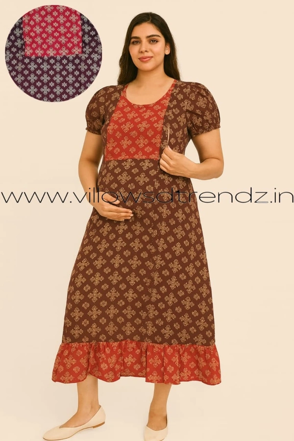 Maternity Maxi|Feeding Maxi| Frock Nighty| Night Gown| Nighty| Invisible Zip on Both Sides| Back side adjustable Knot| Brown | FF2600010