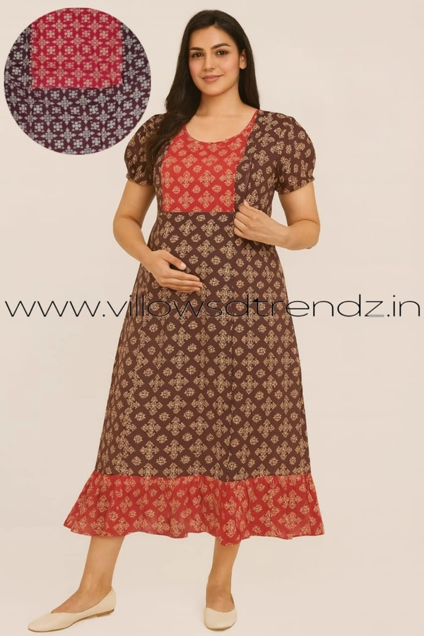 Maternity Maxi|Feeding Maxi| Frock Nighty| Night Gown| Nighty| Invisible Zip on Both Sides| Back side adjustable Knot| Maroon | FF260007