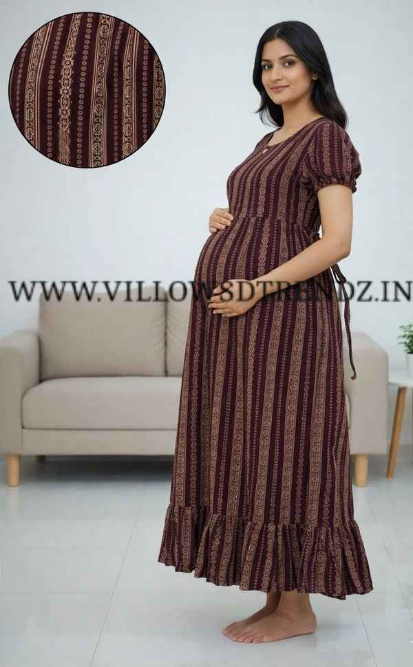 Maternity Maxi|Feeding Maxi| Frock Nighty| Night Gown| Nighty| Invisible Zip on Both Sides| Back side adjustable Knot| Puff Sleeve| Brown | FG40007