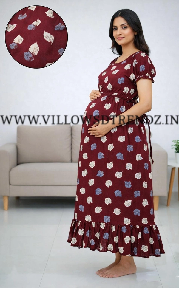 Maternity Maxi|Feeding Maxi| Frock Nighty| Night Gown| Nighty| Invisible Zip on Both Sides| Back side adjustable Knot| Puff Sleeve| Maroon | FG400017