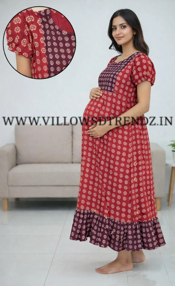 Maternity Maxi|Feeding Maxi| Frock Nighty| Night Gown| Nighty| Invisible Zip on Both Sides| Back side adjustable Knot| Puff Sleeve| Red | FG40005