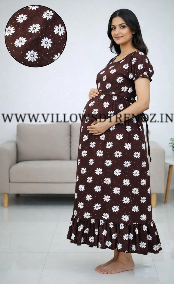 Maternity Maxi|Feeding Maxi| Frock Nighty| Night Gown| Nighty| Invisible Zip on Both Sides| Back side adjustable Knot| Puff Sleeve| Rust brown | FG400014