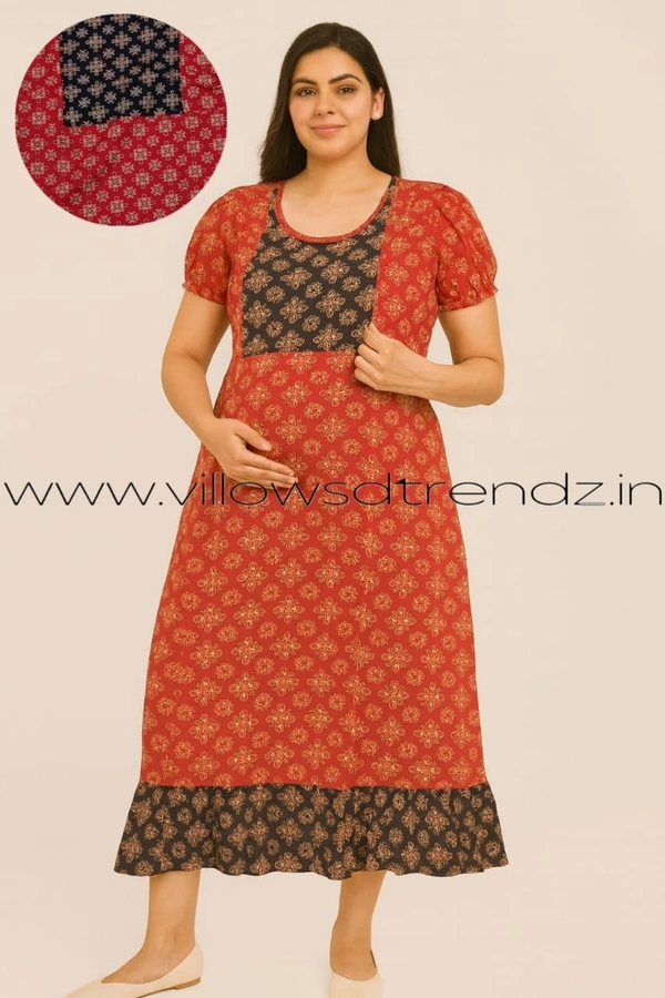 Maternity Maxi|Feeding Maxi| Frock Nighty| Night Gown| Nighty| Invisible Zip on Both Sides| Back side adjustable Knot| Red | FF260008