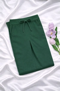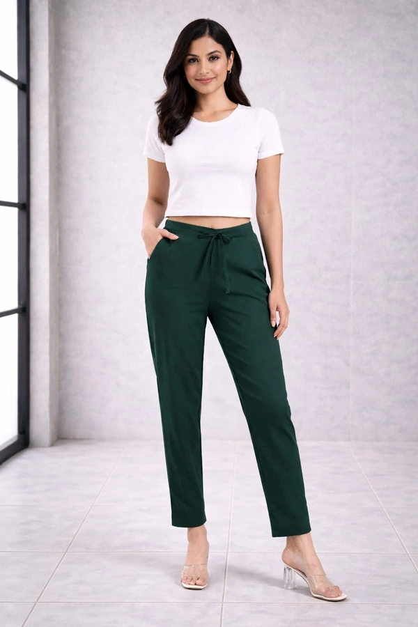 Women's Linen Cotton High Waist Straight Fit Trousers | Ankle Length Casual Pants | 2 Deep Pockets | Bottom Side Slit | Elastic Waistband with Draw String |Bottle Green| KP232253014