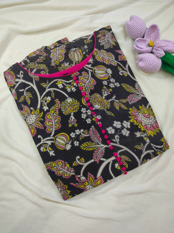 Kalamkari Side Cut Kurti � Product Description Add a touch of tradition with a modern twist to your wardrobe with this elegant Kalamkari Side Cut Kurti. Crafted from soft, breathable cotton fabric, this kurti features beautiful authentic Kalamkari prints that reflect timeless Indian artistry. The stylish side cut design adds a contemporary edge, allowing ease of movement and a flattering silhouette. Perfect for everyday wear, office use, or festive gatherings, this kurti pairs effortlessly with leggings, palazzos, or jeans. Designed for comfort and style, it keeps you relaxed all day while making a graceful fashion statement. || Key Features: � Authentic Kalamkari print � Soft & breathable cotton fabric � Trendy side cut design � Comfortable regular fit |Suitable for daily, office & festive wear |Fabric: Cotton | Style: Side Cut Kurti |Print: Kalamkari| Length: Knee / Calf length (as per design)