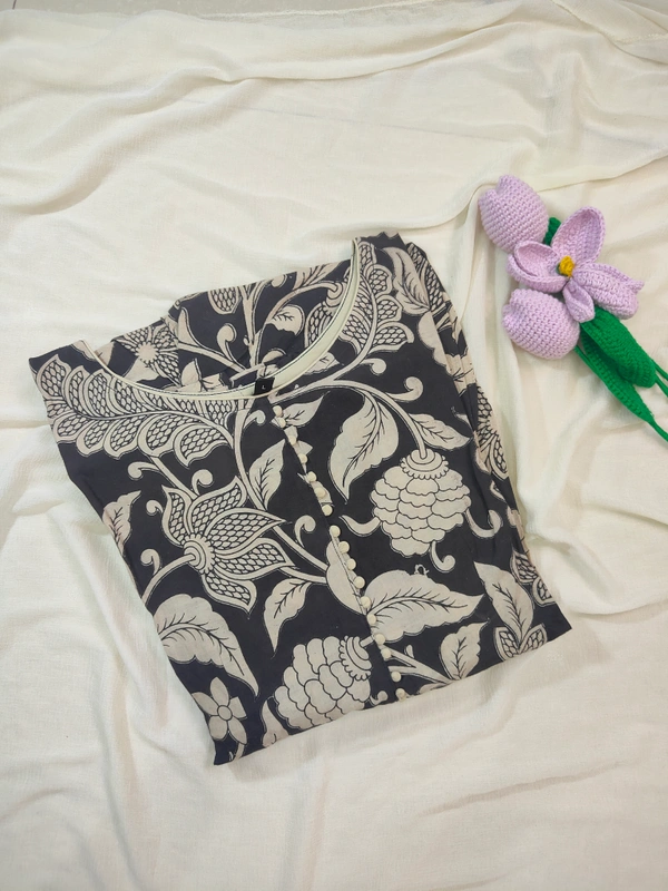 Kalamkari Side Cut Kurti � Product Description Add a touch of tradition with a modern twist to your wardrobe with this elegant Kalamkari Side Cut Kurti. Crafted from soft, breathable cotton fabric, this kurti features beautiful authentic Kalamkari prints that reflect timeless Indian artistry. The stylish side cut design adds a contemporary edge, allowing ease of movement and a flattering silhouette. Perfect for everyday wear, office use, or festive gatherings, this kurti pairs effortlessly with leggings, palazzos, or jeans. Designed for comfort and style, it keeps you relaxed all day while making a graceful fashion statement. || Key Features: � Authentic Kalamkari print � Soft & breathable cotton fabric � Trendy side cut design � Comfortable regular fit |Suitable for daily, office & festive wear |Fabric: Cotton | Style: Side Cut Kurti |Print: Kalamkari| Length: Knee / Calf length (as per design)