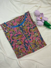Kalamkari Side Cut Kurti � Product Description Add a touch of tradition with a modern twist to your wardrobe with this elegant Kalamkari Side Cut Kurti. Crafted from soft, breathable cotton fabric, this kurti features beautiful authentic Kalamkari prints that reflect timeless Indian artistry. The stylish side cut design adds a contemporary edge, allowing ease of movement and a flattering silhouette. Perfect for everyday wear, office use, or festive gatherings, this kurti pairs effortlessly with leggings, palazzos, or jeans. Designed for comfort and style, it keeps you relaxed all day while making a graceful fashion statement. || Key Features: � Authentic Kalamkari print � Soft & breathable cotton fabric � Trendy side cut design � Comfortable regular fit |Suitable for daily, office & festive wear |Fabric: Cotton | Style: Side Cut Kurti |Print: Kalamkari| Length: Knee / Calf length (as per design)