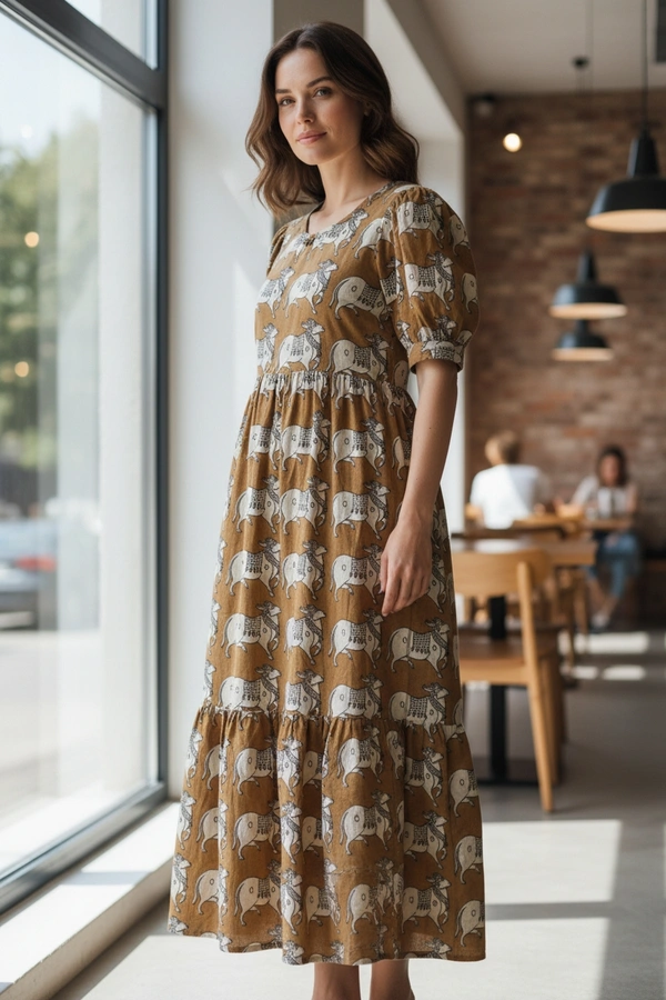 Hand Crafted Original Kalamkari | Frocks/ Maxi| Mustered yellow| KF450013