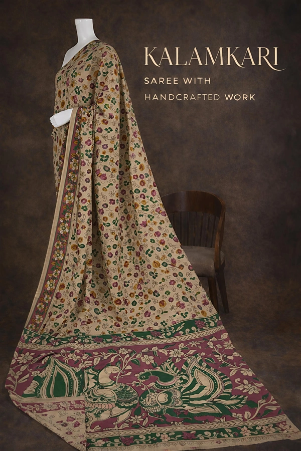 Add timeless elegance to your wardrobe with this stunning Kalamkari cotton saree. Designed with intricate floral prints on a soft beige base and finished with a rich contrast pallu, this saree is perfect for both everyday elegance and special occasions.
